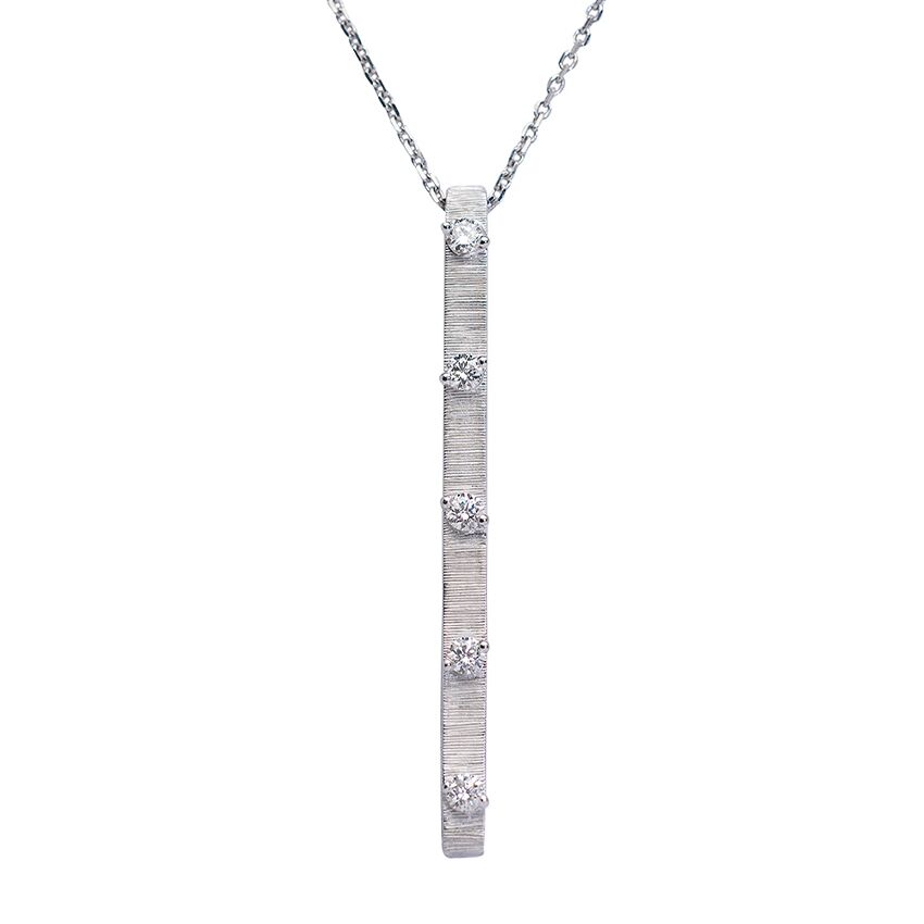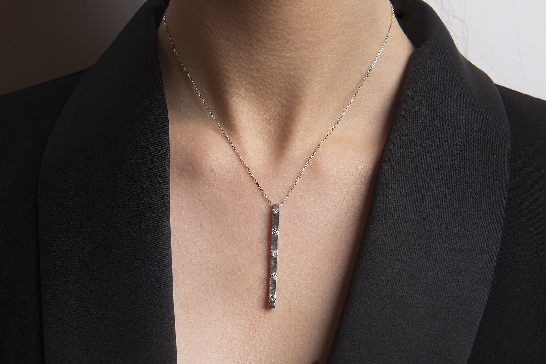 We strive to design timeless jewelry that can be worn every day. This 18 karats white gold necklace is strung with a pendant adorned with round-cut diamonds.
